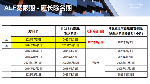 *如果周年日期是周末或公共假期,F(xiàn)SA將在隨后的下一個工作日接受 ALF 申請,不會受到任何處罰,但這不會改變除名日期的計算或較低的恢復(fù)費用期限。