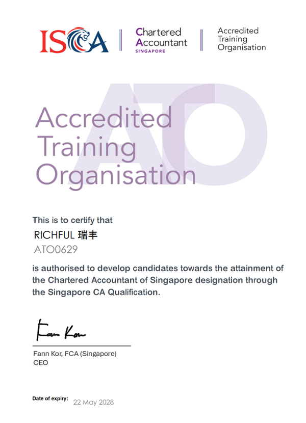 近期,RICHFUL瑞豐通過(guò)新加坡特許會(huì)計(jì)師協(xié)會(huì)(The Institute of Singapore Chartered Accountants, ISCA)審核,正式獲得“認(rèn)證培訓(xùn)雇主”(Accredited Training Organisation, ATO) 資格。該資質(zhì)表明RICHFUL瑞豐在會(huì)計(jì)人才培養(yǎng)體系及專業(yè)實(shí)踐機(jī)制上符合ISCA國(guó)際標(biāo)準(zhǔn),為企業(yè)深化國(guó)際化人才戰(zhàn)略奠定基礎(chǔ)。