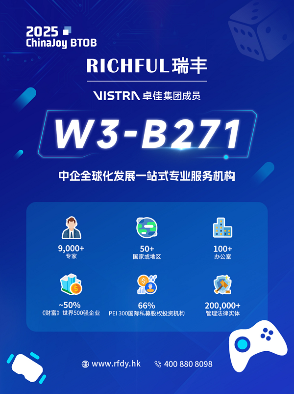 ChinaJoy作為中國乃至全球數(shù)字娛樂產(chǎn)業(yè)的風向標,是連接國內(nèi)外游戲企業(yè)、探索合作機遇的頂級平臺。RICHFUL瑞豐深刻理解中國游戲企業(yè)在“走出去”過程中面臨的合規(guī)、財稅、運營、架構(gòu)搭建等復雜挑戰(zhàn)。我們參展ChinaJoy BTOB,正是為了深度參與這場游戲盛會,與優(yōu)秀的中國游戲開發(fā)者、發(fā)行商、平臺方和投資機構(gòu)面對面交流,分享我們在支持企業(yè)全球化方面的專業(yè)經(jīng)驗,特別是針對游戲出海的關(guān)鍵環(huán)節(jié)。