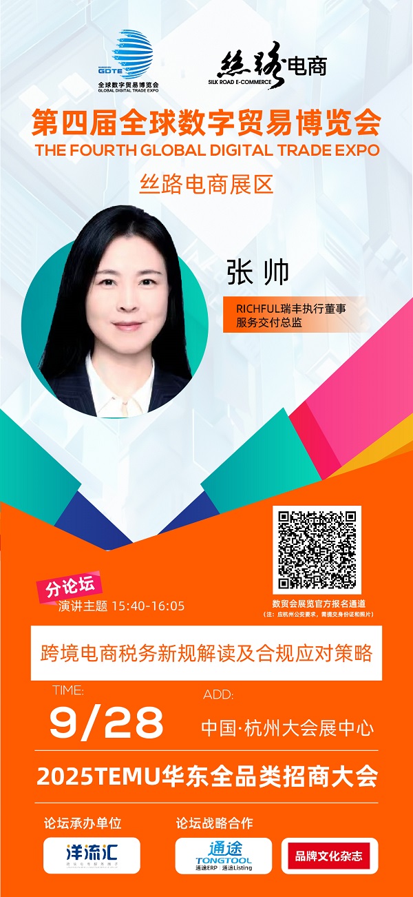 展會(huì)期間(9月28日),RICHFUL瑞豐執(zhí)行董事、服務(wù)交付總監(jiān)張帥女士將出席2025TEMU華東全品類(lèi)招商大會(huì),發(fā)表《電商新規(guī)解讀及跨境電商稅務(wù)全球稅務(wù)考量》重磅演講。屆時(shí)將權(quán)威解讀2025年15號(hào)、17號(hào)公告最新政策,深入剖析四大合規(guī)模式的適用場(chǎng)景與落地策略,幫助企業(yè)應(yīng)對(duì)全鏈條穿透式監(jiān)管新挑戰(zhàn)。
