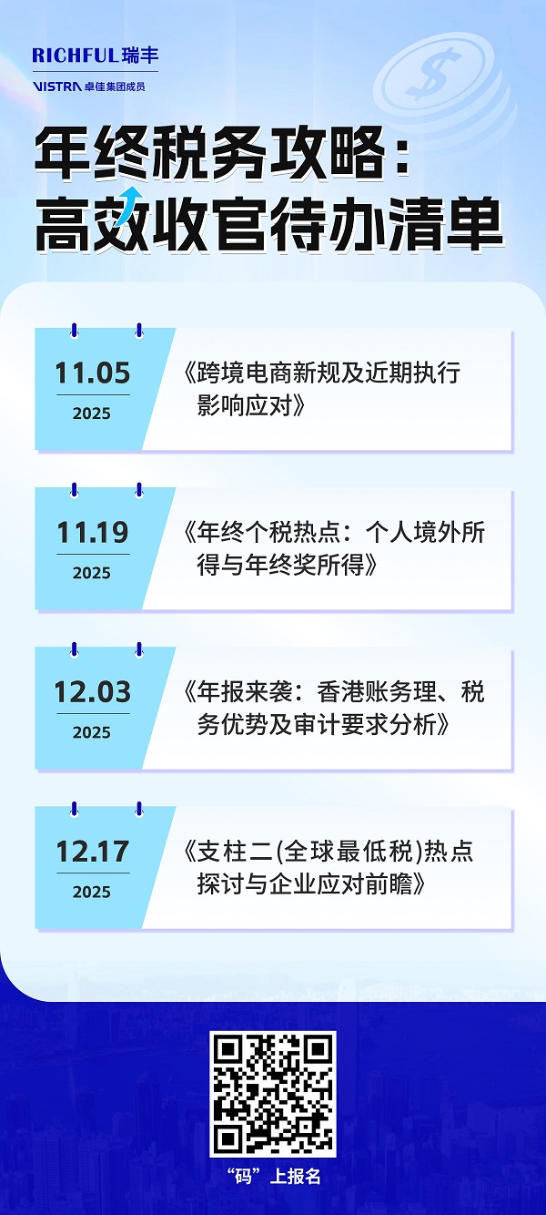 歲末將至,面對紛繁復(fù)雜的稅務(wù)政策與緊迫的年度收官工作,您是否正在尋求一份清晰高效的行動指南?我們精心策劃 “年終稅務(wù)攻略:高效收官待辦清單”系列網(wǎng)絡(luò)研討會,直擊四大關(guān)鍵議題,助您系統(tǒng)梳理合規(guī)路徑,優(yōu)化財稅布局,為2025年的穩(wěn)健發(fā)展奠定堅實基礎(chǔ)。