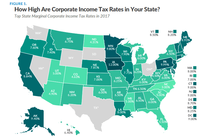 6個州征收的企業(yè)所得稅的最高稅率在百分之九以上。 -- 阿拉斯加州,康涅狄格州,愛荷華州,明尼蘇達(dá)州,新澤西州和賓夕法尼亞州以及哥倫比亞特區(qū)
