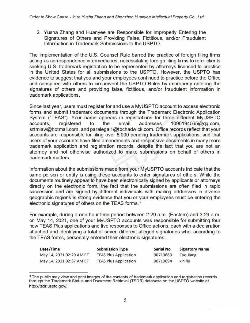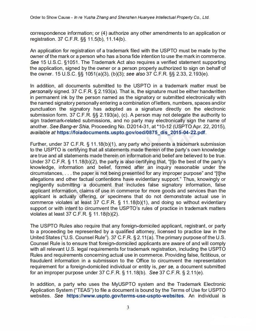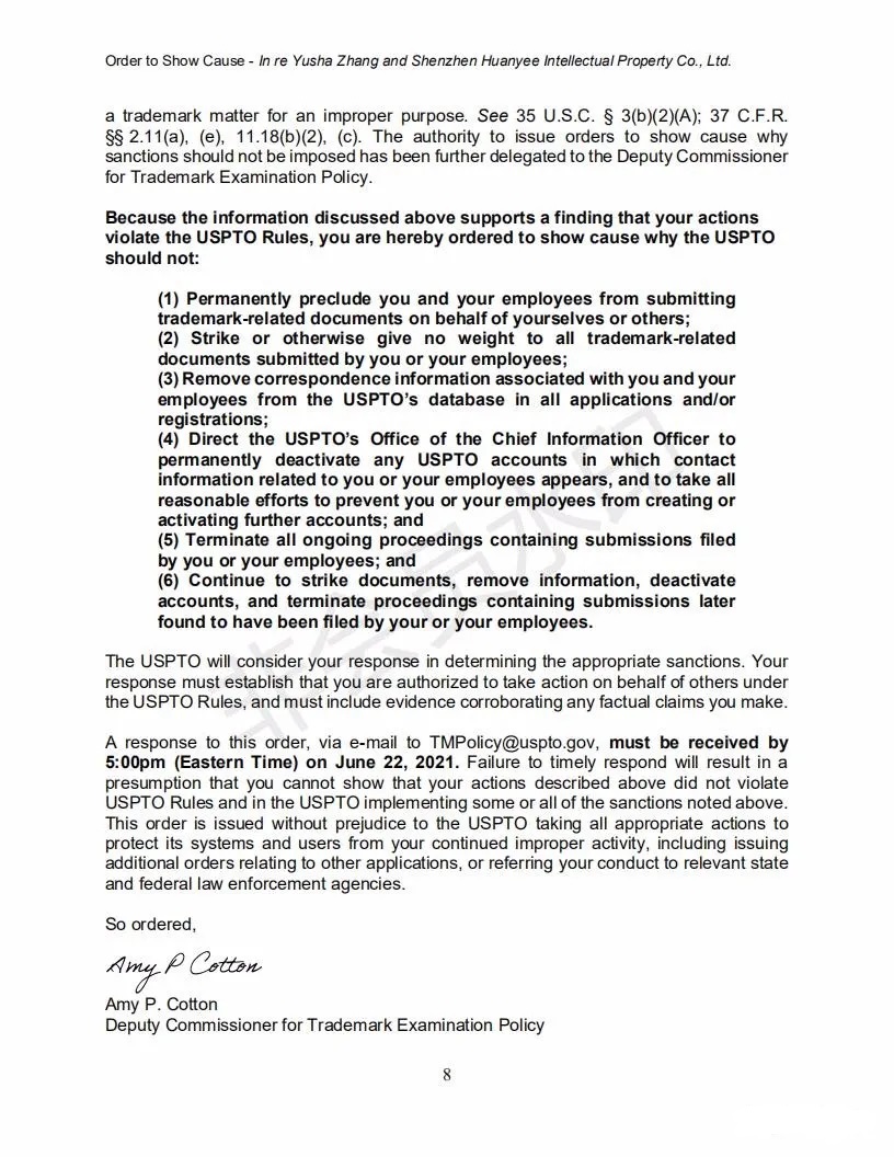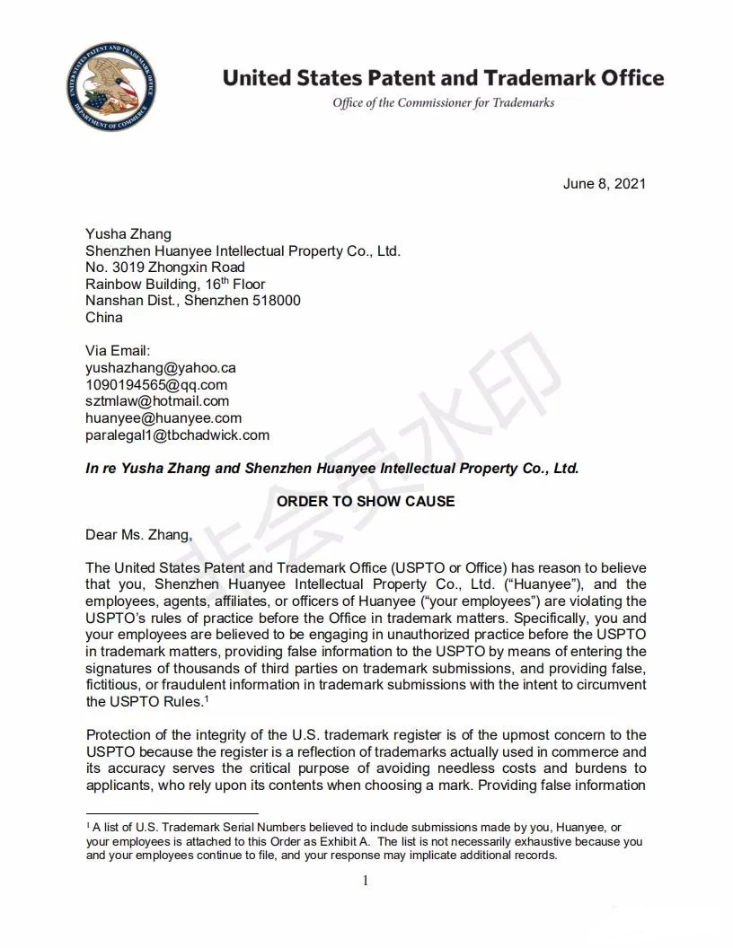 2021年6月8日,美國專利商標(biāo)局(USPTO)向中國深圳一家知識(shí)產(chǎn)權(quán)公司的代表人發(fā)出一份123頁的“ORDER TO SHOW CAUSE”。對(duì)該公司代理提交的批量美國商標(biāo)的行為,尤其是其中涉及到第三方簽名提供虛假、虛構(gòu)和欺詐信息的行為提出質(zhì)疑,要求該公司提出合理的理由,并在美國東部時(shí)間6月22日下午5:00前進(jìn)行回復(fù)。否則USPTO將會(huì)對(duì)該代理機(jī)構(gòu)以及代表人進(jìn)行制裁。