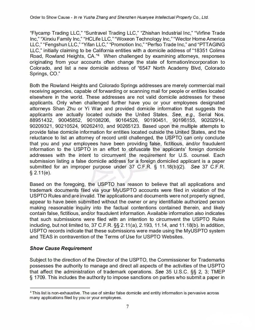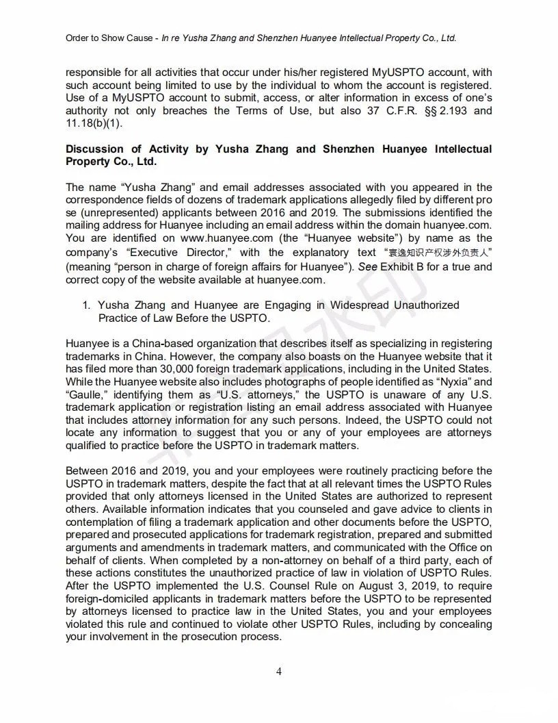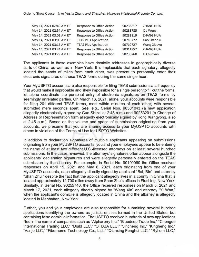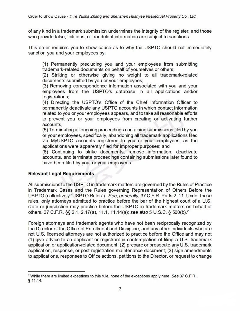 2021年6月8日,美國專利商標(biāo)局(USPTO)向中國深圳一家知識(shí)產(chǎn)權(quán)公司的代表人發(fā)出一份123頁的“ORDER TO SHOW CAUSE”。對(duì)該公司代理提交的批量美國商標(biāo)的行為,尤其是其中涉及到第三方簽名提供虛假、虛構(gòu)和欺詐信息的行為提出質(zhì)疑,要求該公司提出合理的理由,并在美國東部時(shí)間6月22日下午5:00前進(jìn)行回復(fù)。否則USPTO將會(huì)對(duì)該代理機(jī)構(gòu)以及代表人進(jìn)行制裁。