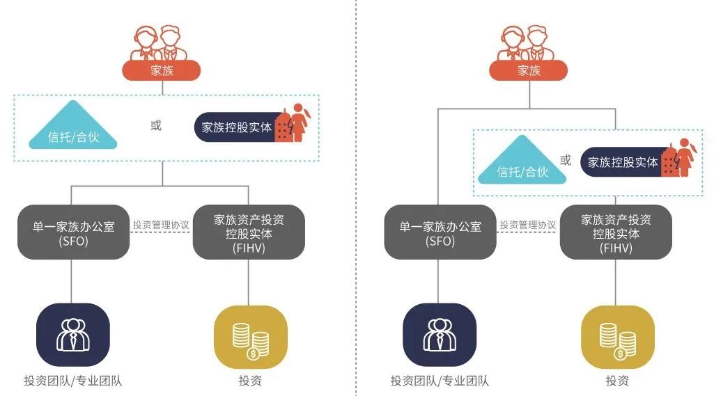 一般來(lái)說(shuō),家族可以直接或間接持有家辦,并通過(guò)家族信托和合伙制的穿透型或家族實(shí)質(zhì)控股公司兩種架構(gòu)持有FIHV。FIHV通過(guò)簽訂投資管理協(xié)議委托家辦提供服務(wù):